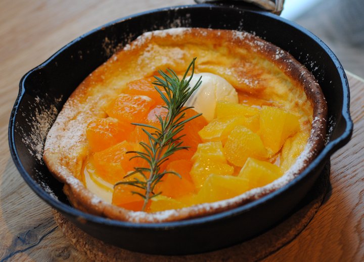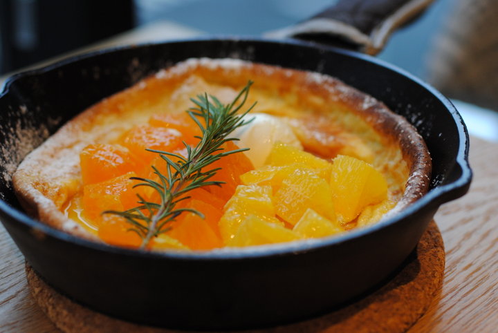 お店の看板メニューのひとつが、熱々の小さなスキレット(鉄のフライパン)を器に提供されるパンケーキ。 なかでも、旬のフルーツを使った季節限定メニューがイチオシです♪ 現在は、でこぽんが主役の「ごろごろ果実の蜂蜜パンケーキ」が食べられます。 生地は卵たっぷりで、食感はもちもち。でこぽんはみずみずしく、甘みも強く、一緒に添えられたクリームチーズとオレンジ蜂蜜ソースとの相性が絶妙です。