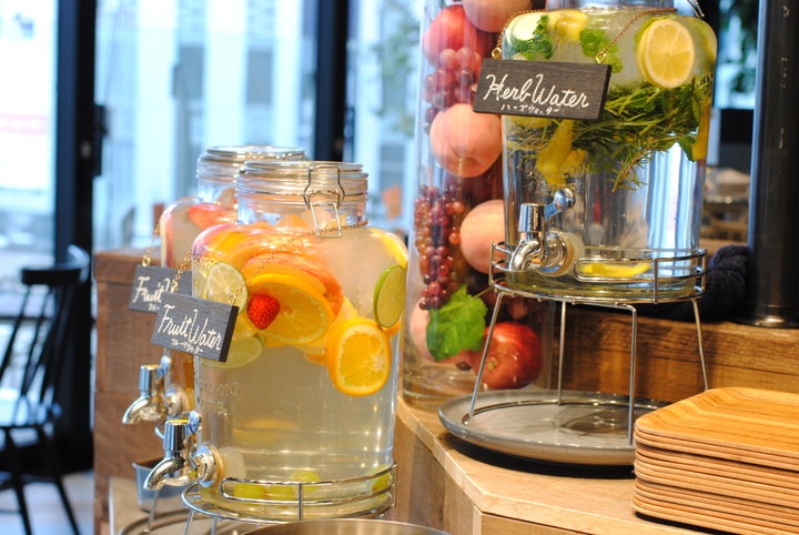 こちらはデトックスウォーターコーナーです。 入店すると、りんごやオレンジ、レモンなどが入ったフルーツウォーター、りんご味のフルーツヴィネガー、ローズマリーやミントなどのハーブウォーター3種類を自由に飲むことができます。どれもほんのり淡い香りが楽しめますよ。
