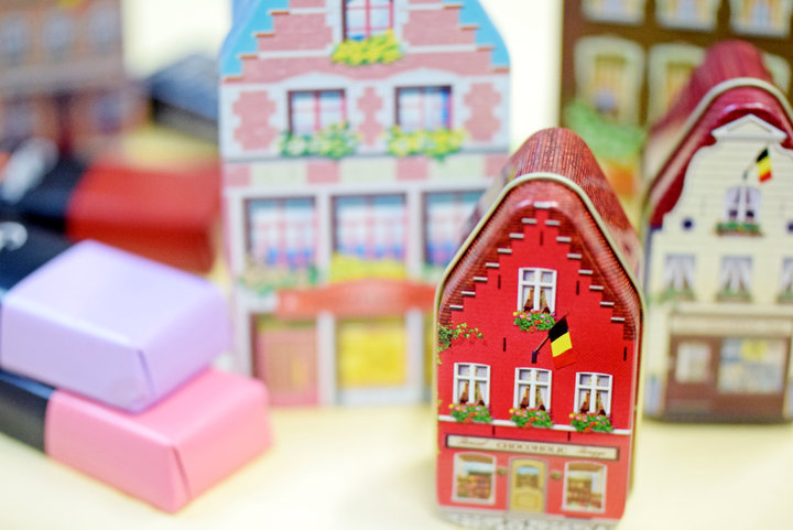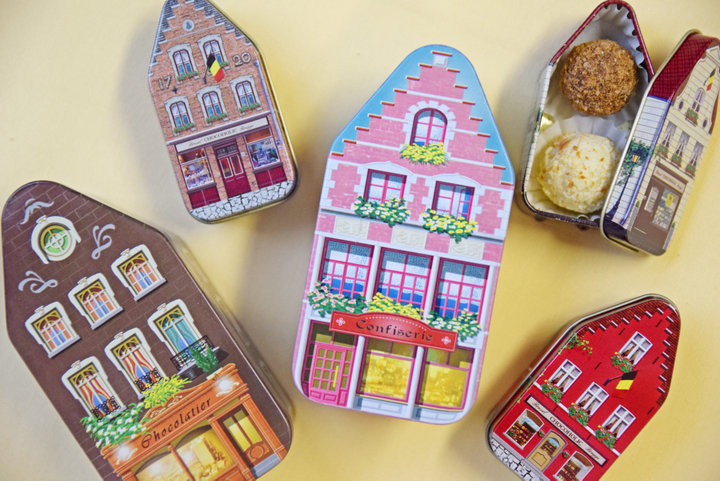 もうひとつ、ベルギーらしさを醸し出すのがベルギーの伝統的な家屋をモチーフにした缶に入ったお菓子です。 この缶はいろいろなところで見かけますが、中に入っているものはさまざま。チョコレートだったり、クッキーだったり、お店によって異なります。 サイズも小さなものから大きなものまでいろいろあり、デザインも何種類もあるので、選ぶ楽しさがあります。 中のお菓子を食べ終わったあとは飾っておけるので、何か形に残るおみやげを渡したいときは、こちらがおすすめです。
