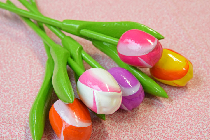 オランダといえばチューリップ畑を思い浮かべる人は多いと思いますが、残念ながら生花は持ち帰ることができません。また球根も植物検疫書が必要となります。 少しでもオランダのチューリップエッセンスを持ち帰りたい・・・と思う方におすすめなのが、こちらの木製チューリップ。1本からバラ売りされており、色の種類が豊富です。値段は1本2ユーロ程度で、たいてい3本で5ユーロなど、まとめ買いすると割引があります。1色ずつ違う色を購入したり、あえて同じ色で揃えるなど、好みに合わせて購入できるのが楽しいです。 購入はアムステルダムならシンゲルの花市で。ムント広場からコーニングス広場までのシンゲル運河に沿ってたくさんの露店が並んでいるエリアです。 アムステルダム以外でも、風車で有名なザーンセ・スカンスなど主要な観光スポットで売られています。
