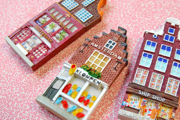 同じくシンゲルの花市や観光客向けのおみやげやさんで見かけるのがオランダの伝統的な家屋をモチーフにしたマグネット。 よく見ると、木靴屋さん、ワッフルショップ、レース編みのお店など、オランダを代表する産業や工芸のショップになっていて、凝った造りになっています。 値段はサイズにもよりますが、だいたい木製チューリップと同様ひとつ2ユーロ程度で、3つで5ユーロなどまとめ割りされてるところが多いです。 ひとつでもかわいいですが、飾るのならいくつか並べてアムステルダムの運河沿いを再現してみると面白いですよ。