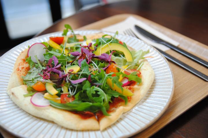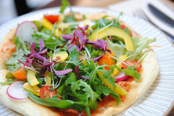 気になるメニューには、オーガニック野菜をたっぷり使ったサラダプレートやピザ、塩やきそば、豚肉以外のお肉を使ったステーキ、カレーなどが並んでいます。ハラールフードには豚肉やアルコールは認められていませんが、こちらのお店は洋食を中心にしたメニューのため、日本人にも親しみのある味わいばかりです。 「フレッシュサラダピザ」(1000円)は、ピザ生地にトマトピューレのソースを敷き、その上に彩り豊かな旬の野菜をたっぷり。爽やかなレモンをプラスしたゴマドレッシングをかけていただきます。トマトピューレの酸味がほど良い味のアクセントに。お肉を使っていないので、ベジタリアンの方にもおすすめです。