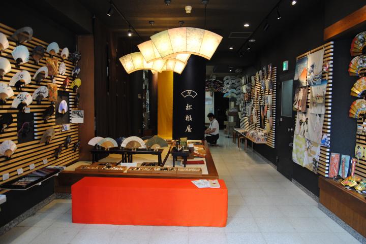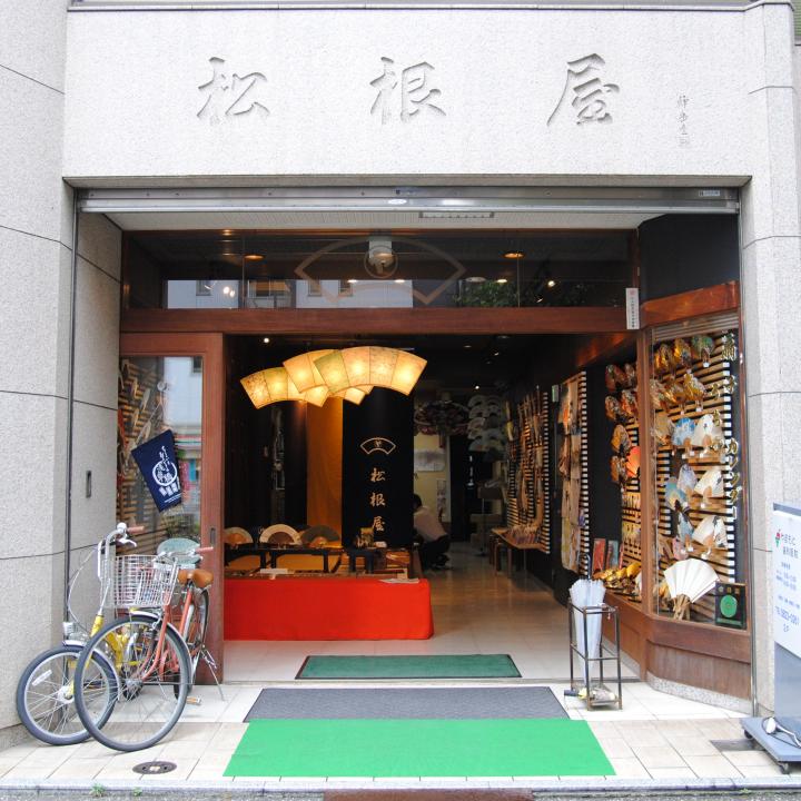 都営地下鉄浅草線浅草橋駅A4出口から徒歩3分。江戸通りを浅草方面へと進んでいくと、通り沿いに「松根屋」はあります。 こちらのお店は、かつて日本橋横山町にあった本家「松根屋」の番頭だった初代・山本慶一さんが、1914(大正3)年にのれんわけして開いた扇子とうちわの販売店です。現在は4代目である山本慶大さんが古き良き文化を大切にしながら、現代の人たちにも親しみやすい店づくりを心がけています。 創業100周年を迎えた2014年に店内は和モダンでおしゃれな空間へと改装され、若い人や外国人観光客も訪れています。 入ってすぐのスペースに飾られた、およそ100種類もの扇子。扱っているのは扇子の発祥とされ、1000年以上の歴史を持つ京扇子が中心です。京扇子は扇骨を作る職人、絵師、地紙を折る職人と細かく分業され、何人もの職人の手を経てでき上がります。そうして作られた品を目利きして、店頭に並べています。
