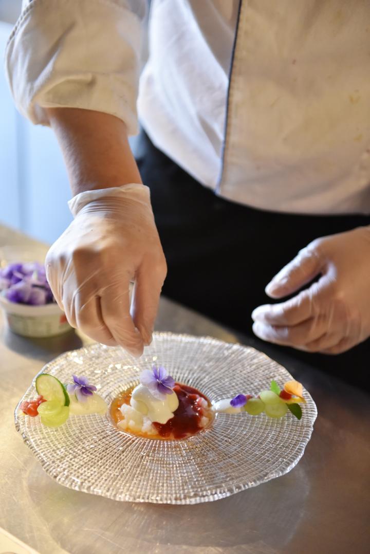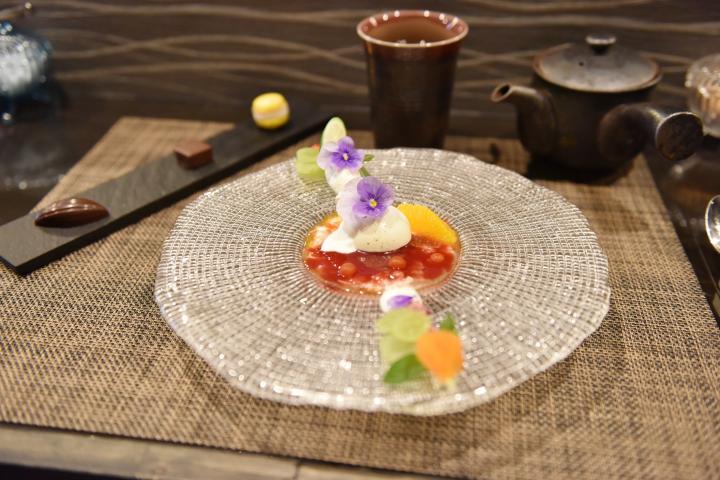 メインは4種類から選べます。今回はとくに女性におすすめという「野菜とフルーツのデセール」をチョイス。パティシエの松下さんが、ガラスの皿にフルーツソースやチーズ、エディブルフラワーなどをていねいに盛り付けていきます。まるでお皿に絵を描くかのように芸術的。その様子をつぶさに見ることができるのが、カウンター式の醍醐味です。 トマトとオレンジを使った冷たいスープに、ギリシャヨーグルトのアイスとミントのグラニテなどを合わせたこのスイーツ。とても多くの食材を使っているのに、それぞれの酸味と甘味が見ごとに調和して、おいしさが口の中に広がります。高級店でないとなかなか味わえないような、プロのパティシエの味。それをこんなに気軽に楽しめるなんて驚きです。