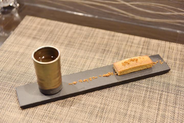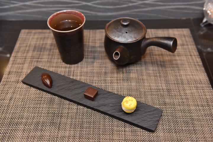 まず出てくるのは、コーヒーや紅茶などから選べる飲み物と、3種のお茶菓子。お茶菓子の内容は日によって異なり、この日は手作りチョコレートとマカロンでした。黒く細長い石の皿に、マカロンの黄色がよく映えています。スイーツがより明るく美しく見えるよう、テーブルの真上にはライトが設置されています。ここでの主役は徹底してスイーツなのです。