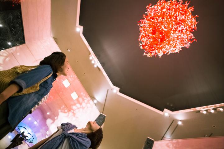 次に訪れたのは「大一美術館」。19世紀後半のアール・ヌーヴォー期から近現代まで、幅広いグラスアートを収蔵・展示する美術館です。 さっそく館内に入ると、頭上に燃え盛るようなオブジェが見えます。 あれはなんでしょう?