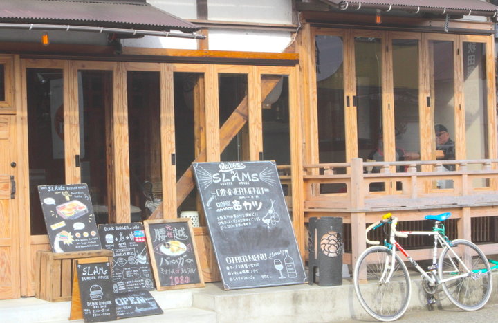 鎌倉と藤沢を結ぶ江ノ電の腰越駅〜江ノ島駅間は、電車が道路をガタゴトと走る路面区間になります。この一帯は昔ながらの商店や、古い佇まいの家が点在する昭和レトロな雰囲気。ほっとするような懐かしい街並みに溶け込んでいるのが、築100年ほどの古民家を改装した「スラムスバーガーハウス」です。 スタッフが宮大工と一緒にリノベーションしたという店は、どっしりした屋根、夏には全面開放されるガラス戸、手すりの造作が美しい縁側といった外観で目を引きます。