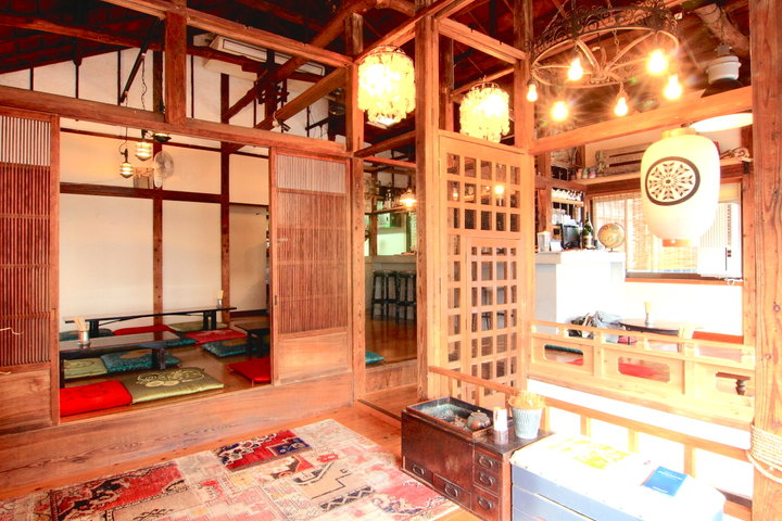 店内は板張りのお座敷で、高い天井や太い柱、立派な梁は古民家ならでは。お座敷には卓袱台と座布団が置かれ、時間の流れがゆるやかになるような、落ち着く空間が広がっています。