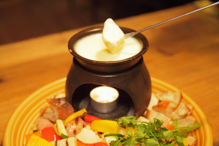 野菜は、ひと手間かけて、薪火焼きとグリルの二重焼きで焼き上げます。フォンデュソースはエメンタールチーズなど全3種類のチーズとナチュラルソース、白ワインをブレンド。とってなめらかで、深みのあるソースです。