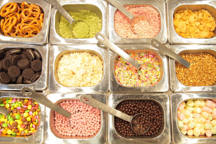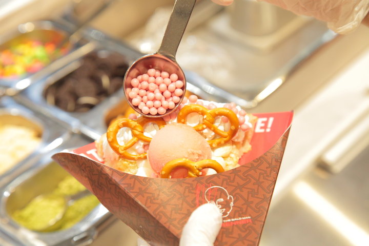 次に選ぶのは、トッピング(50円/100円)。トッピングは、アイスやフルーツ、ホイップクリームのほか、ミニオレオ、プレッツェル、マーブルチョコ、あずきなど全部で約15種類。最大5つまで選べます。