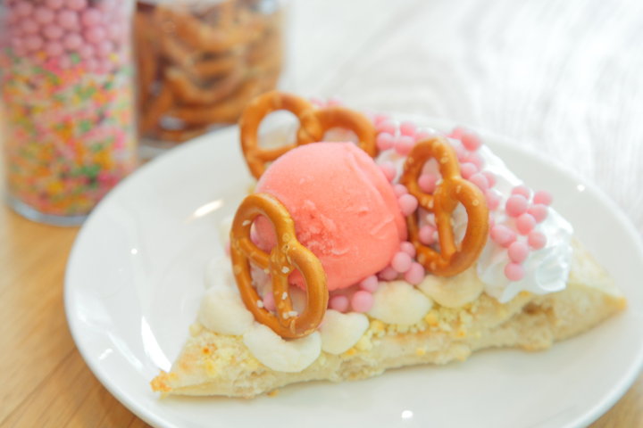 また、キュートなピンク色の「ホワイトストロベリーシャーベット」(730円)は、暑い季節にぜひ味わいたい一品。ひんやりいちごアイスと温かいピザ生地の冷たさと温かさがたまりません。プレッツェルの食感も楽しいスイーツです。