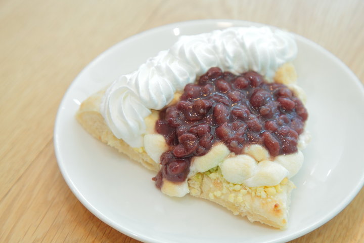 スタッフのおすすめの組み合わせは、“抹茶ピザ”。ホワイトチョコをベースに、チョコレートを細かく砕いて粉末状にした抹茶チャンク、あずきとホイップクリームがたっぷり。抹茶の香りとチョコの深い味わいが口いっぱいに広がりますよ。