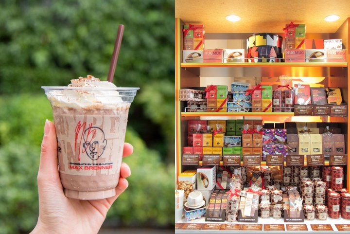 コーヒーやシェイクなどのドリンク(200円~)やアイスチョコレートミルク(580円)、「マックス ブレナー」でも取り扱いのあるチョコレート商品も販売中。