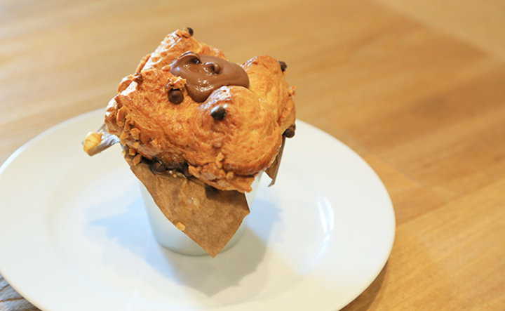 「マフィノワズリ」の中で特に人気が高いのが「ヌテラ」。フランスのパンのお供として定番のヌテラをたっぷり包んだスイートな1品です。 こんがりと香ばしい表面にアーモンドとチョコチップが散りばめられカリカリ食感を楽しむと、やがてもっちりとしたパン生地とヌテラが現れます。外はサクサク、中はもっちりのクロワッサン生地はもちろんおいしいのですが、甘く濃厚なヌテラが加わることでよりスイーツっぽさがアップ。クロワッサンとマフィンのいいとこ取りをした、ハイブリッドスイーツの名にふさわしいメニューです。甘〜いヌテラはコーヒーとの相性も抜群ですよ。