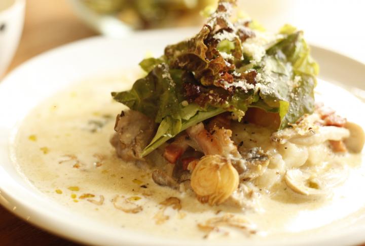 こちらのおすすめは焼きリゾットで、ランチタイムは4種類の中から選ぶことができます。「ベーコンときのこのクリームソースの焼きリゾット」(1200円)は生米からていねいに炊き上げ、さらに焼きあげることで、もちもちのお米がべたっとすることなく飽きずに食べられます。モッツァレラとパルメジャーノチーズを使ったコクのあるクリームが、よりいっそう食欲をそそります。