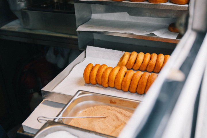 カラフルなドーナツが並ぶ支店とは異なり、ここで販売されているドーナツはシュガー・シナモン・チョコレートの3種類のみ。 ドーナツはその場で揚げられ、通りを行き交う沢山の人たちが歩みを止めては買っていくため、常に揚げたて新鮮なドーナツが食べられます。