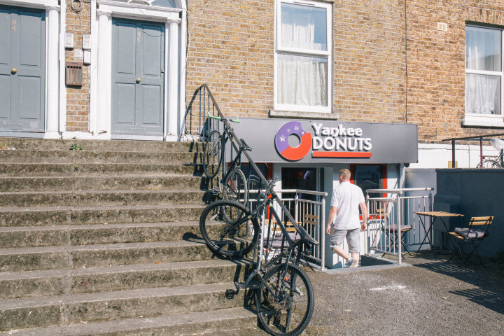 長い歴史をもつ一店目から打って変わり、「Yankee Dotuts」(ヤンキー・ドーナツ)は、2017年6月にオープンしたダブリンで最も新しいドーナツ屋さん。 場所は中心地から歩いて約20分ほど南に下った落ち着いたエリア。ダブリンでは3〜4階建ての集合住宅が多いのですが、その建物の半地下部分に入居するという珍しい造りが特徴です。