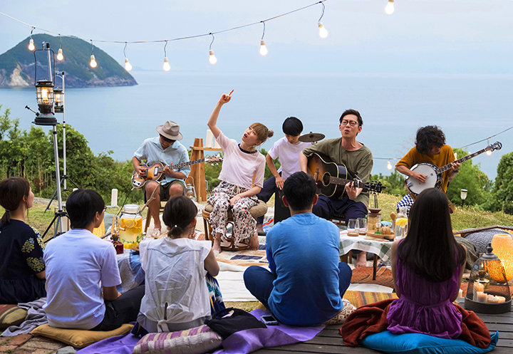 夕暮れ時、リスティングの外に用意された特別なステージ。暮れゆく瀬戸内海を背景に、キャンドルやランプのやさしいあかりが灯る、自然と一体の空間で演奏される音楽。招待された3組6名のファンを前に、マイクを通さない生音、アコースティック編成のシークレットライブがはじまりました。
