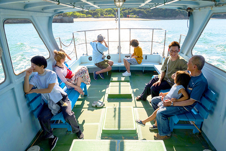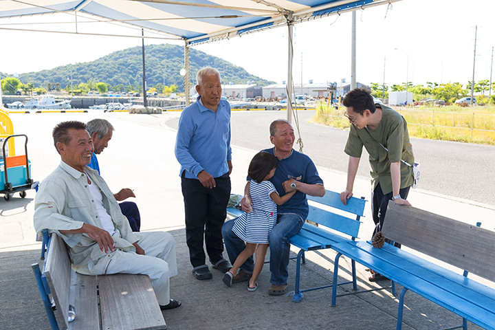 リスティングでひと休みしてから、真鍋さんにおすすめしてもらった地元スポットへでかけた5人。 無人島へ向かう途中、渡船場で地元のおじいちゃんたちと出会いました。海辺の街への旅ということで、夜釣りに行くのを楽しみにしていたatagiさんは、ここぞとばかりに釣り情報を質問。とりとめのない世間話をしたり、おじいちゃんが連れていたお孫さんの女の子に話しかけたり、地元の人たちと気さくに交流していたメンバー。ホストに教えてもらったスポットへ向かう途中にも、一期一会の出会いがあります。