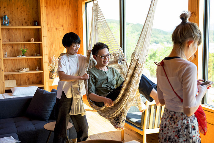 室内に入ると、目に飛び込んでくるのは海。この景色を堪能するために特注したという大きな窓越しに、瀬戸内海の絶景が広がります。木の香りが心地よく、インテリア好きのホストがセレクトした雑貨が並ぶ空間。 海を見渡す窓辺には、この地域への移住者さんが手作りしたというメキシカンハンモックがつるされています。