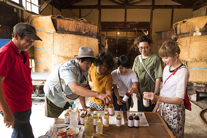 260年以上前から米酢を作っている醸造所では伝統的なお酢の作り方を見学し、オーナーの説明を熱心に聞いていたメンバー。ラベルの手描きイラストがすてきなお酢ドリンクは、オーナーの息子さんが描いた絵だと知り、そのかわいさにみんな 釘付け。帰り際には、敷地内で採れたてのイチジクをおみやげにと持たせてくれました。