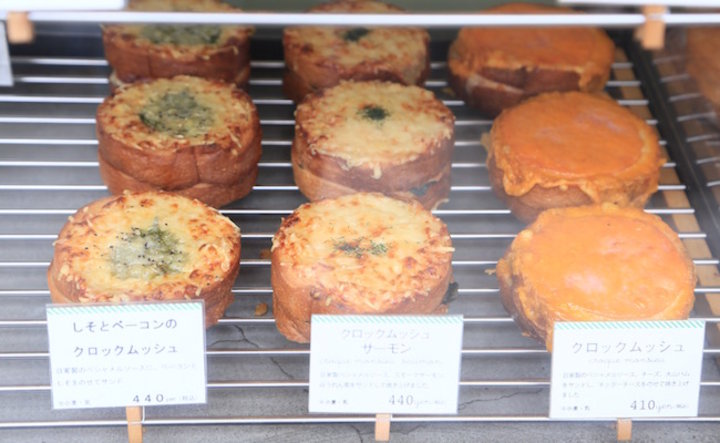 クロックムッシュは3種類。「クロックムッシュ(ハム)」、「クロックムッシュ サーモン」は定番メニューで、もう1種類は時期によって具材を変える季節メニュー。取材に訪れた6月は、初夏ということで「しそとベーコンのクロックムッシュ」が並んでいました。しそのシルエットがちらりと見えて見た目もかわいいですね。