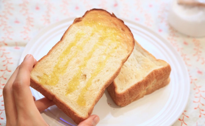 下山さんのアドバイスに習い、こんがりトーストし、オリーブオイルと塩でシンプルにいただいてみました。さっくりとした歯ざわりで、ほどよい口どけ!とても食べやすく、毎日食べても飽きない食パンです。トーストすることによって、山の部分がとってもパリパリに。それでいてパンの部分はやわらかく、もちっとしているから不思議です。「食感を楽しんでほしい」とはこのことだったのか、と思わず納得。 少し小ぶりのシンプルな食パンなので、ジャムやバターなど色んなトッピングで楽しめそう。厚さを変えて切って、食感の違いを楽しむのも◎。