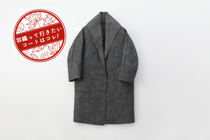 表面はやわらかなヘリンボーン柄、裏はモノトーンのチェック柄、上質な2つの表情が楽しめるリバーシブルコート。ラウンドショルダー×大きめの衿で女性らしさもアップ。