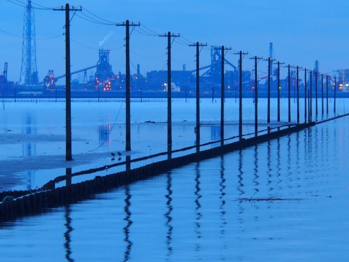 千葉県木更津市にある、日本のウユニ塩湖と呼ばれる江川海岸。海まで永遠に続くかのように並んだ電柱が満潮時には水面に映り、とても幻想的。とっておきの一枚を撮影したいなら、夕暮れ時から夜の間の、あたりがオレンジ色から夜の闇に変わる時間帯がおすすめです。