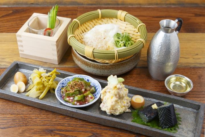 手前は「おばんざい盛り合わせ」(918円)。お酒の注文は半合(486円~)から可
