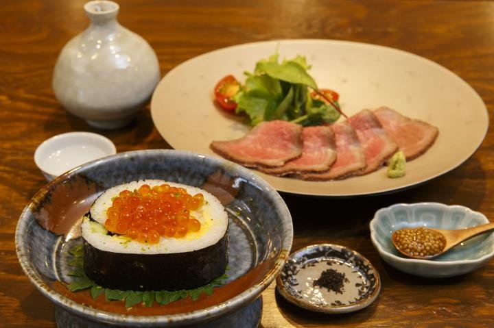 手前は「海鮮サラダ太巻き寿司 イクラ醤油漬けを添えて」(648円)