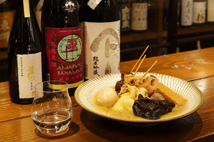 烏丸御池から歩いて10分ほどの高倉二条にある「にほん酒食堂しずく」は、全国各地から選りすぐった日本酒と、お酒の魅力をより引き立てる料理が味わえるお店です。こちらでは、実力のある若手蔵元のものを中心に、常時30種類以上の日本酒がそろいます。和食とイタリアンでそれぞれ経験を積んだ2人のシェフによる料理もお店の自慢。冬限定メニューのおでんを食べながら、旬の日本酒を楽しんでみませんか?