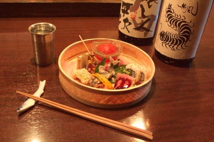 綾小路富小路にある「ざんぐり 綾富」では、旬の焼き魚や名物の「焼き八寸」を、厳選された日本酒や焼酎とともに味わえます。コースもありますが、仕入れによって内容が変わる「焼き八寸」が人気。魚の塩焼きやツブ貝のうま煮、野菜のナムルや煮びたしなど、彩り豊かな料理が四方八寸の幅の美しい器に盛りつけられ、目と舌を喜ばせてくれます。厳選して仕入れる日本酒との相性もばつぐんですよ。