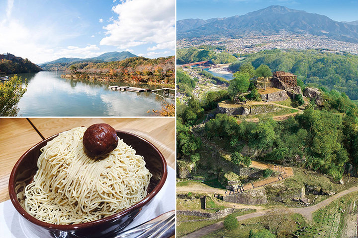 桜百選にも選ばれた恵那峡(左上)や恵那名産の栗をふんだんに使った「恵那川上屋」の巨大モンブラン(左下)続日本百名城に選ばれた「苗木城」(右)