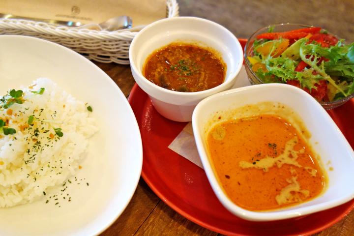 カフェのメニューはすべて手作りで、素材の良さを生かしたシンプルな味つけが基本。新鮮な野菜をたっぷり使った「2種のカレー」(1000円)は、通常、「ナスと挽き肉のカレー」、ココナッツを使った「タイ風レッドカレー」、「チキンカレー」などの3種類から2つをチョイスできます。そのほか「しそご飯のオムライス」(850円)や「トマトクリームのパスタ」(900円)など、どれを頼んでも外れなしのおいしさ。 ランチタイムには、メインにセットで本日のデリとスープのどちらかを選べます。デリのなかでも特に人気が高いのが自家製ドレッシングを使ったアボカド、パプリカ、水菜のサラダです。
