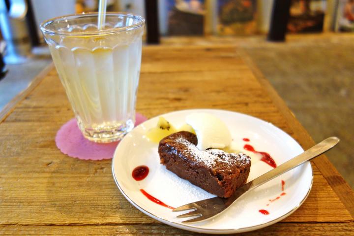 バニラアイスが添えられた自家製スイーツの「クラシックショコラ」(写真右・400円)は、濃厚なチョコレートケーキのこってりとした甘さが評判。「レモネード(アイス)」(写真左・500円)は、はちみつとレモン果汁の甘酸っぱさが爽やかな味わいです。 オーガニックにこだわった「コーヒー」(450円)や「ホットチャイ」(500円)、アルコールなども各種そろっています。