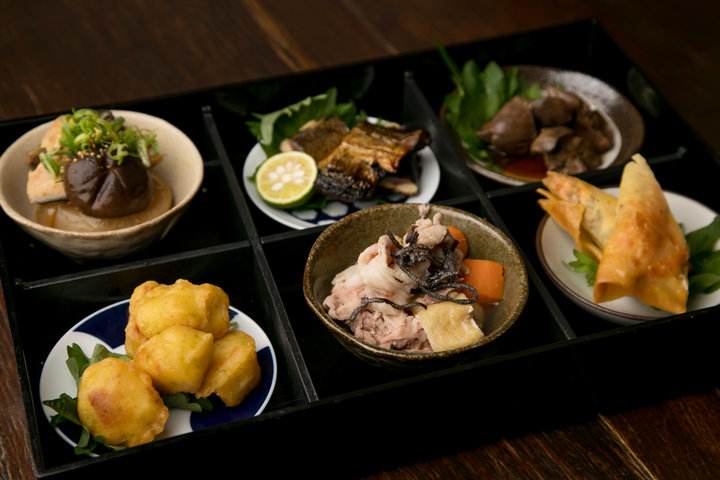 大和野菜や大和ポークなど「奈良にはおいしい食材がある」と話す店主。 地産地消を意識したアラカルト料理を6種類盛り合わせた「六種盛合」をはじめ、柿をイメージする人も多い奈良のおつまみとして、大和柿酢のピクルスや柿と奈良漬とクリームチーズなども。