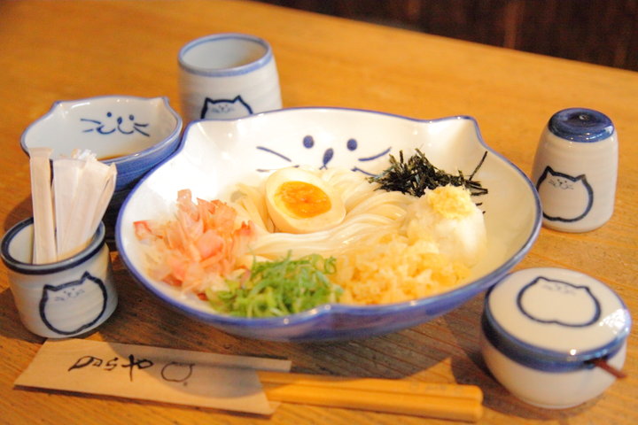 こちらは、昆布とかつおの出汁が体にやさしく染みわたる関西うどんのお店。そのうどんのどんぶりから出汁のおちょこ、おにぎりがのった小皿まで、愛嬌たっぷりの猫が顔と耳をのぞかせる食器がかわいく、ほっこりとした気分で猫づくしのひとときを楽しめます。
