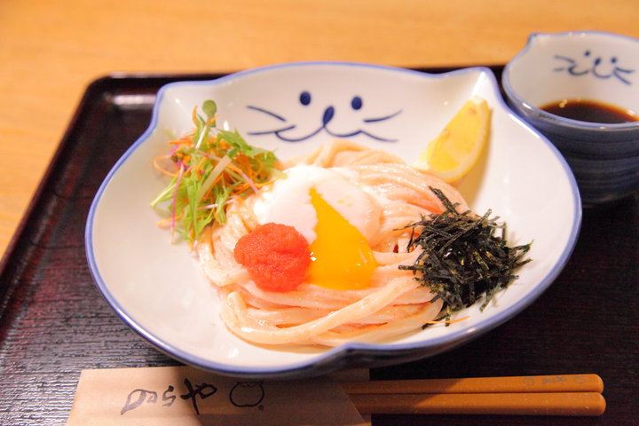 一番人気のうどんは「クリーミー明太子うどん」。マヨネーズとあえた明太子ソースのまろやかな辛みと出汁の旨みが相性ぴったりです。温泉たまごを割るとコクが増し、レモンをしぼるとさっぱり。風味に変化をつけられるのも箸が止まらない理由です。
