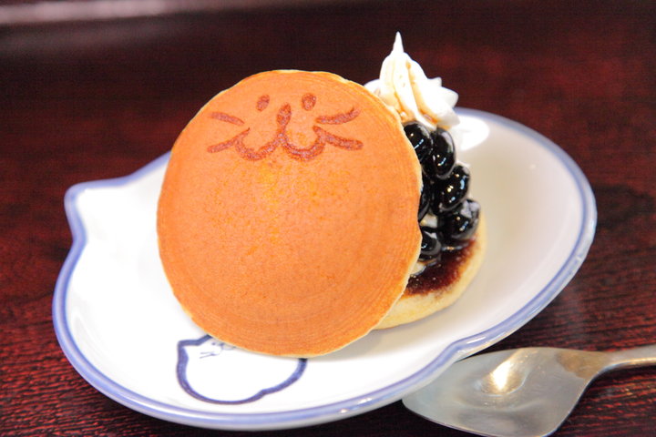 デザートは季節変わりのどら焼きがおすすめ。どら焼きの皮にはのらちゃんの焼き印が押してあります。12月から2月まで限定の「どらアイス」は生地の上にバニラアイス、丹波黒豆の甘露煮、生クリームをのせ、黒蜜をとろり。黒豆の深みのある味が印象的ですよ。
