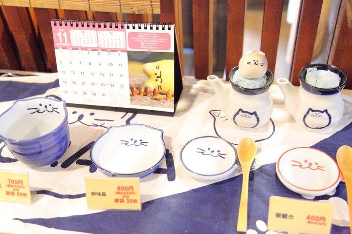 猫の食器は購入することもでき、グラタン皿やマグカップなどメニューで使われていない食器もさまざま並んでいます。箸袋を集めると、その枚数ごとに好きな食器と交換できる楽しみもあり、ひとつふたつと揃えている人も多いそうですよ。