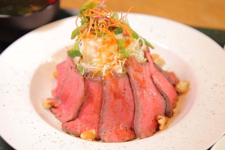 三軒茶屋店では今年の秋から、うどんのほかに洋食メニューが登場。ランチで味わえる「ローストビーフ丼」は真空調理によって旨みを逃がさずタレを浸透させたもの。厚みのある肉がしっとりとジューシーで、噛みしめるごとに旨みがあふれ出てくると好評です。