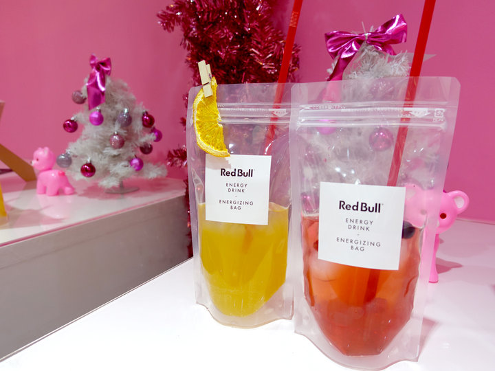 写真上は、見たこともないような大きなリース。クリスマスらしさ抜群で「かわいい!」と大人気です。 またドリンクコーナーでは、エナジードリンクを使った4種類のカクテルをいただくことができますよ。ビニールのパックやショットグラスに入ったユニークなドリンクも、インスタ映えする楽しいアイテムになりそう。