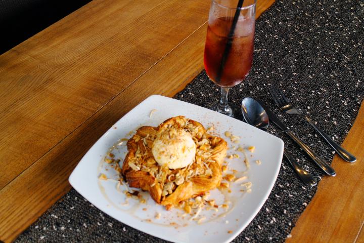 数々のお店を食べ歩き、好きが高じてついには自分でお店を持ったというオーナーが作る特製アップルパイ。ぎっしり詰められたリンゴにポンとのせられたアイス、そして散りばめられた手づくりグラノーラとにぎやかな一皿です。口に運ぶと、いくつも重ねられたパイシートのサクサク感にリンゴのしっとり感、さらにグラノーラのザクザク感が一度に味わえます。酸味がきいたリンゴを使っているので、ちょうどいい甘さであっという間に食べきってしまいそう。リンゴがおいしくなるこれからの季節に、ぜひいただきたいメニューです。