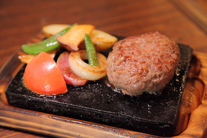 ディナーでおすすめは「究極のハンバーグ」。高温に熱した溶岩石にのせられ、肉汁が跳ねる音や香りとともにテーブルに運ばれます。 牛肉100%のお肉の食感と味が出るように、大きめに挽いたミンチをたっぷり使用。溶岩石の遠赤外線効果によって内側から火がじっくりと入るため、ふわっとやわらかく、お肉のジューシーな旨みが口の中に広がります。野菜もそれぞれ食感よく、驚くほど甘いです。