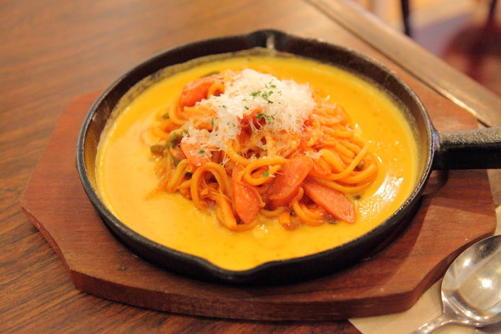 スキレットで提供される「究極のナポリタン」は、オーナーの出身地である名古屋の溶き卵を流し込むスタイル。もちもちの生麺にとろとろの卵と粉雪のようにかかったパルミジャーノ・レッジャーノチーズをからめながらいただきます。