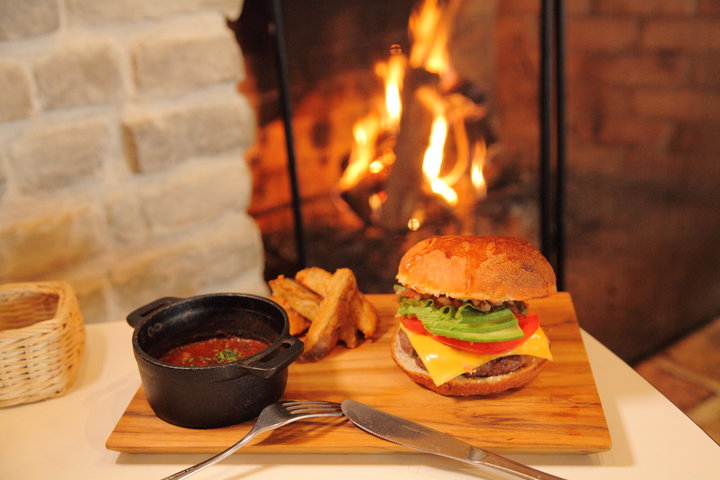 暖炉の近くの席は薪がぱちぱちと燃える音が聞こえ、香りもほのかに漂ってきて心地よいと人気。ディナーには照明が落とされ、ゆらめく炎がより浮かびあがるため、さらにあたたかな雰囲気になります。席を予約することもできるので、リクエストしてはいかが。