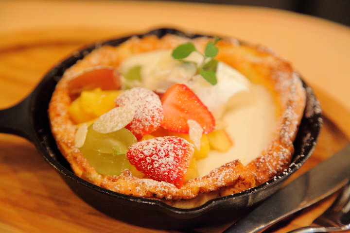 「ダッチベイビー」(800円、ランチのみ)。熱い生地と冷たいフルーツが口の中でとけ合う