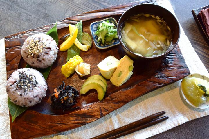 お昼時に訪れたらぜひオーダーしたいのが、数量限定の「古代米のおにぎりプレート」(864円)。長野県産の野菜や米で作られた、田舎のなつかしさを感じさせるメニューです。季節の素材を生かしたやさしい味付けの副菜には、もっちりと甘い古代米のおにぎりがよく合います。少量ずつたくさんの料理が上品に盛りつけられ、栄養バランスも完璧です。