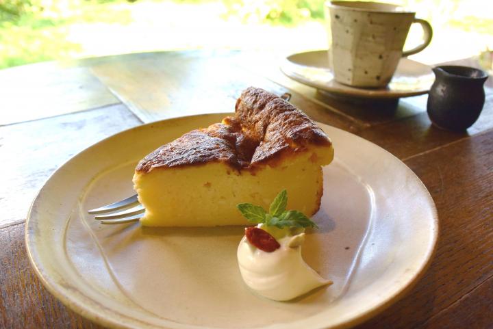 午後のティータイムには、手作りケーキのセット(864円)を。人気のベイクドチーズケーキは、濃厚なチーズがまったりと口に広がり、苦めのコーヒーがほしくなります。ネルドリップでじっくりと淹れるコーヒーには、陶芸の町・笠間のお店で焙煎されたオーガニックの豆を使用しています。